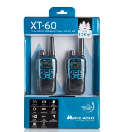 MIDLAND XT60 PMR446 TWIN PACK TRANSCEIVERSABOUT MIDLAND XT60 PMR446 TWIN PACK TRANSCEIVERSThe Walkie Talkie more complete and more powerful range as ever On the beach, at a festival or just a keen adventurer enjoying a day out, XT Line is a great way to keep in touch. Extremely reliable, XT Line is the ideal solution for those who want to talk in all situations. The XT60 is a fully featured twinband licence free radio and is supplied with a twin dock fast charger and re-chargeable battery packs. Main functions Dual Band LPD/PMR transceiver Channels: 24 PMR446 (8+16 pre-programmed) + 69 LPD Side Tone: end of transmission beep LCD display with backlight Low battery indicator Auto power save: automatic current economy circuit 38 CTCSS and 83 DCS tones in TX and RX CALL button with 5 tones selectable Battery life up to 12 hours Automatic squelch adjustment Buttons for the channel selection SCAN function Keypad lock Hi/low power selection (PMR band) Roger Beep on/off VOX for hands-free communications with 9 selectable levels 2 Pin jack for ext. mike / ext. speaker Content of the package 2 transceivers with belt clips 1 x USB cable 1 double fast desktop charger 2 rechargeable battery packs 700mAh Instruction leaflet